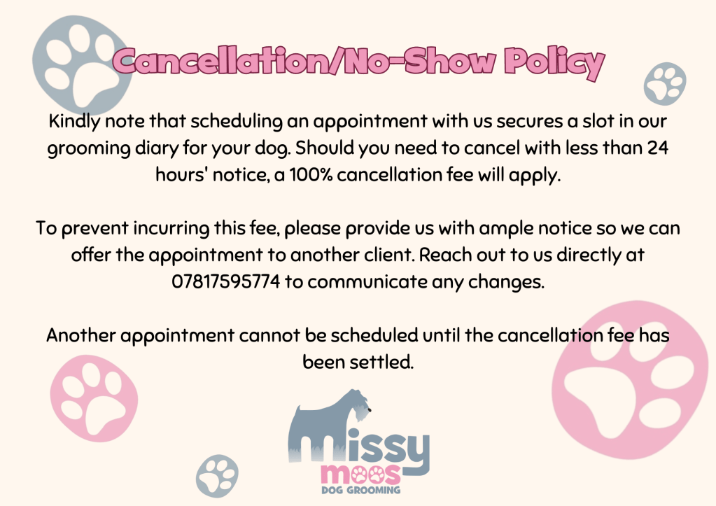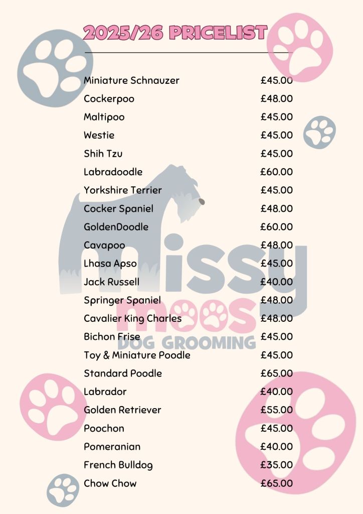 Here at MissyMoo’s we offer a range of dog grooming services to suit you and your pets needs! Starting from nail clips all the way up to a full groom with VIP Upgrade.